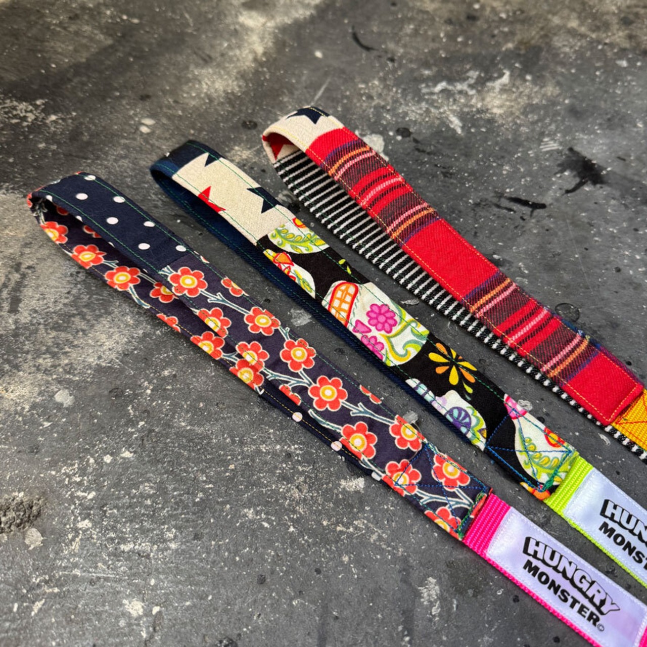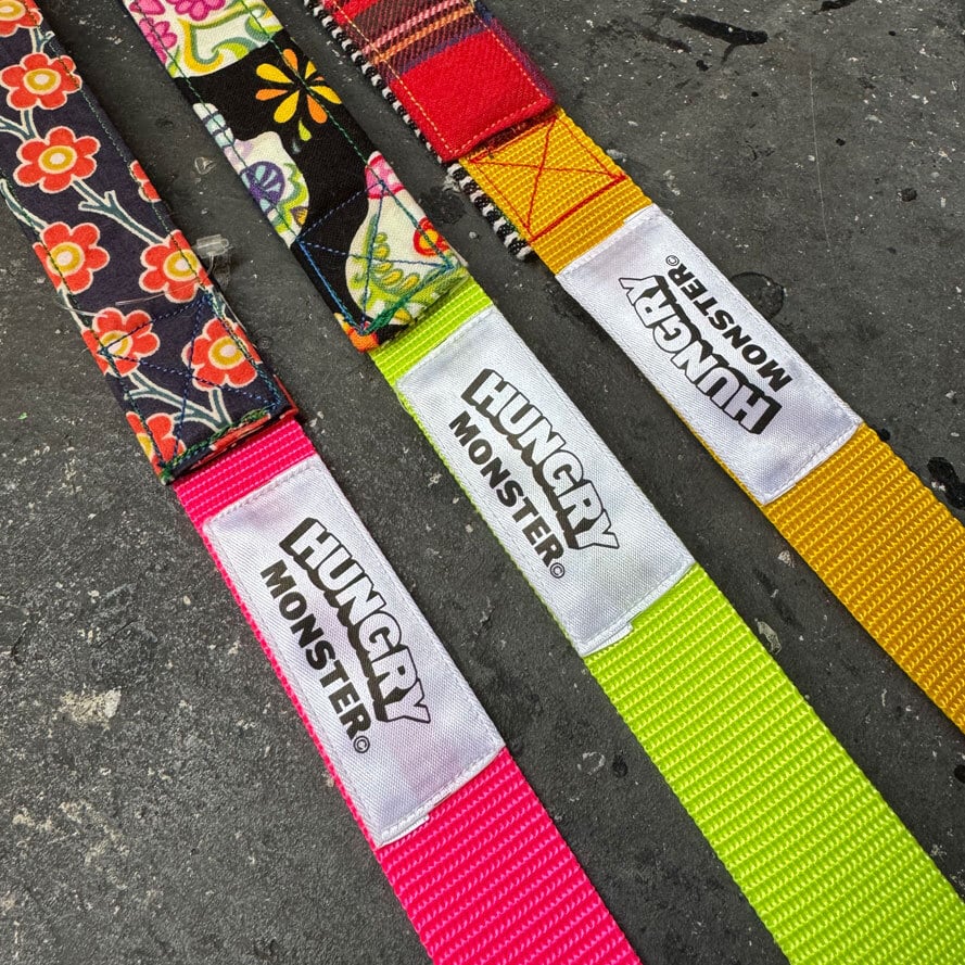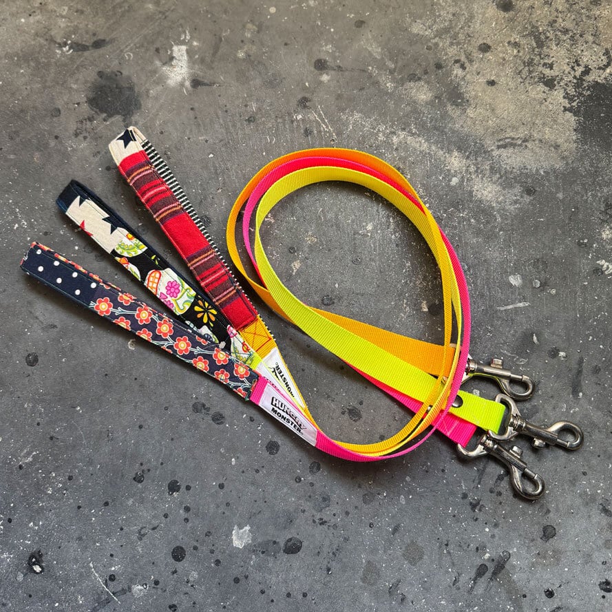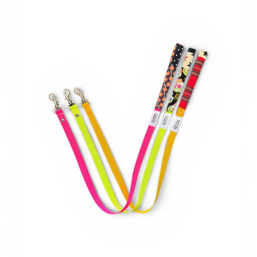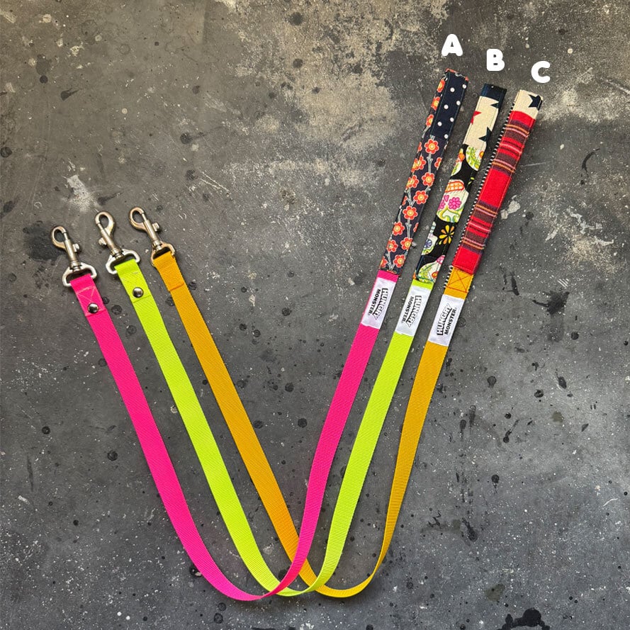 ・夜でも安全な目を引くカラーの幅2.5cmのナイロンベルトを使用したシンプルなリードです。